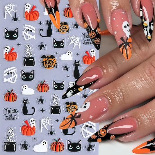 4Pcs Halloween 5D Embossed Nail Stickers Cute Ghost Nail Decals Self-Adhesive Pumpkin Spider Web Flower Ghost Nail Design Cats Skeleton Hand Nails Decorations Halloween DIY Manicure Supplies for Women