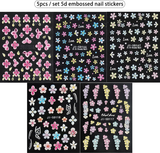 5D Embossed Flower Nail Stickers, 5PCS Colorful Floral Nail Art Stickers Pink Cherry Blossom Hibiscus Daisy Nail Decals Self-Adhesive Pegatinas para Uñas Spring Summer Decoration