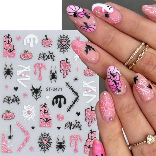 6 Sheets Halloween Nail Stickers for Nail Art 3D Self-Adhesive Pink Glitter and Black Spider Web Spider Pumpkin Bat Pattern Nail Art Stickers Holiday DIY Manicure Tips Nails Accessories for Women
