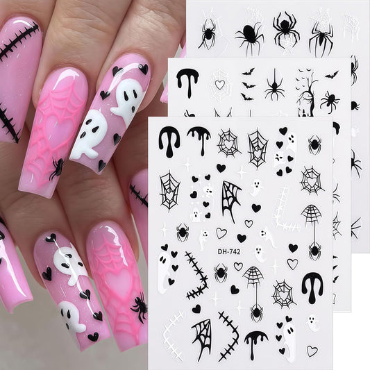 6 Sheets Halloween Nail Art Stickers 3D Self-Adhesive Cute Ghost Spider Spider Web Pumpkin Nail Stickers Black Spiders Pattern Nail Sticker for Day of The Dead Holiday Nails Decor Accessories