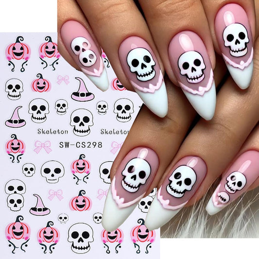 6 Sheets Halloween Nail Art Stickers Decals Pink Skull Spider Web Sugar Skull Nail Decoration 3D Self-Adhesive Nightmare Christmas Stickers for Women Girls