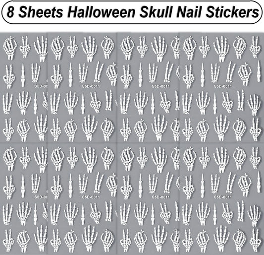 8 Sheets Halloween Nail Stickers 5D Embossed Skull Finger Nail Stickers Self-Adhesive Horror Skeleton Decals for Women