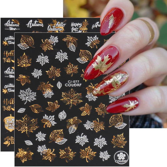9 Sheets Bronzing Fall Nail Art Stickers 3D Self-Adhesive Metallic Maple Leaf Nail Stickers Thanksgiving Nail Art Supplies Laser White Gold Leaves Flower Nail Designs Autumn Sticker for Acrylic Nails