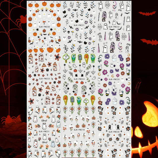 9 Sheets 3D Halloween Nail Art Stickers Self-Adhesive Cute Skull Pumpkin Bat Ghost Spider Designs Cartoon DIY Flowers Nail Art Stickers Decals Halloween Nail Supplies for Women Nails Art Decoration