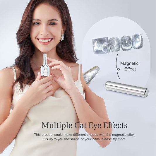Cat Eye Gel Nail Polish with Magnet Stick, 15ml Magnetic Gel, Create Stunning Cat Eye Effects for DIY Manicures, Long-Lasting, Salon-Quality Finish, Silver Glow