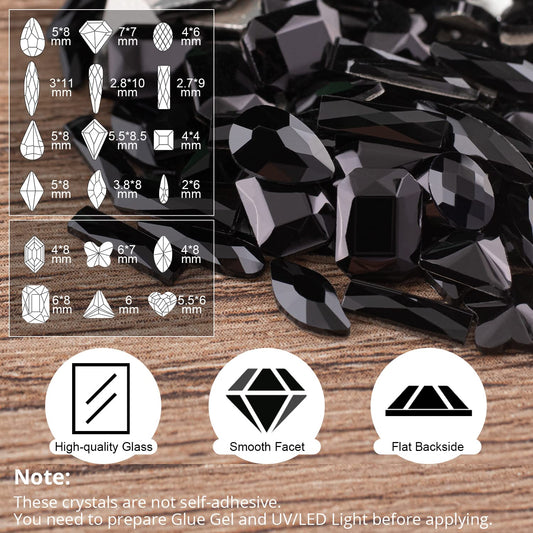 18 Styles Multi-Shaped Glass Gemstones for Nails and 6 Sizes Round Crystal Rhinestones Kit #4, Black Nail Art Charm Bead Manicure Decoration with Pickup Pencil and Tweezer