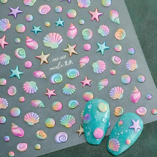 2 Sheets Starfish Nail Stickers - 5D Embossed Self-Adhesive Decals for Summer Nail Art - Colorful Beach Shell Design Supplies Decoration for Women and Girls