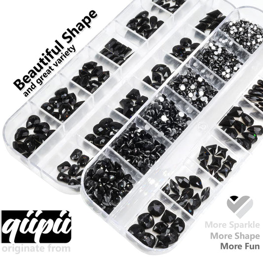 24 Styles Jet Black Nail Rhinestones Multi Shapes Flatback Gems Round Beads K9 Glass Crystals Stones Diamonds Jewels Nail Art Charms Supplies for Nails Face Eyes Makeup Crafts Tumblers Bottles