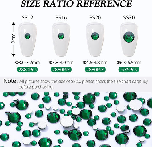 Green Flatback Rhinestones, Glass Rhinestones for Nail Art and Craft, Glue Fix, Loose Crystal Gemstones(Green, SS12, 2880pcs, 2.9-3.0mm)