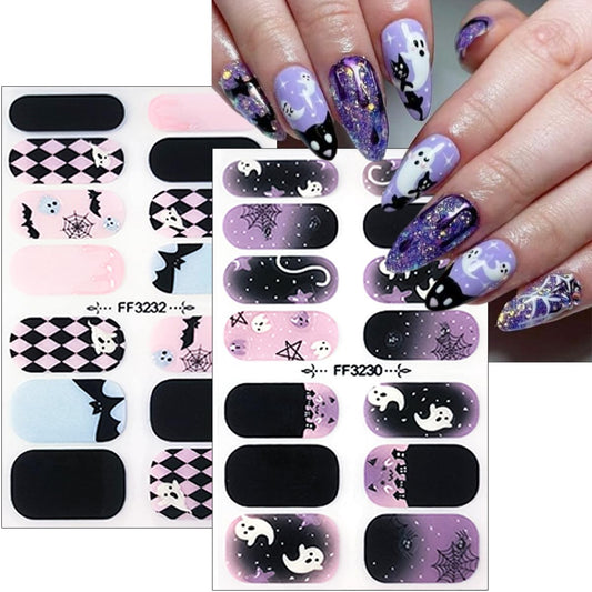 Halloween Gel Nail Stickers for Nail Art 3D Halloween Ghost Nail Art Stickers Cute Full Nail Wraps Stickers Halloween Nail Polish Stickers Spider Bat Moon Star Gel Nail Strips Decals for Women Girls