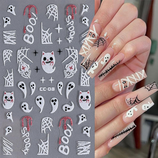 Halloween Ghost Nail Stickers 5D Embossed Halloween Nail Decals for Nail Art Designs Self Adhesive Cute Pumpkin Spider Nail Art Stickers Flower Nails Supplies for Women Nail Manicure