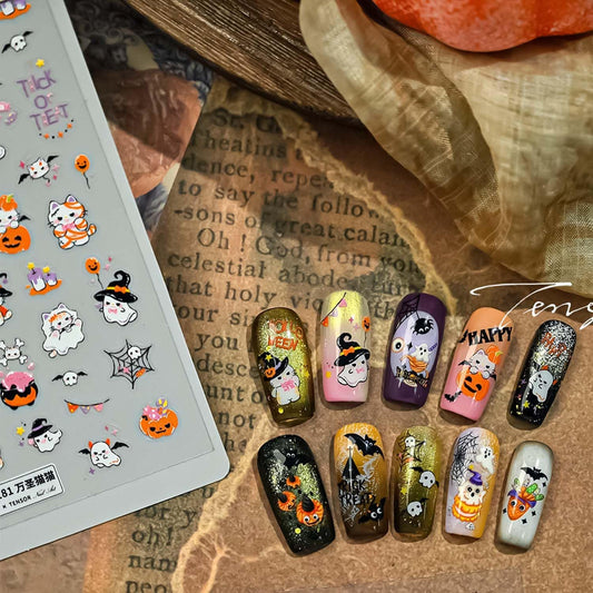 Halloween Nail Art Sticker Cute Cat Nail Stickers Pumpkin 5D Self-Adhesive Nail Decals Spider Web Bat Nail Sticker Ghost Nail Art Decal for Women DIY Manicure Decoration Supplies