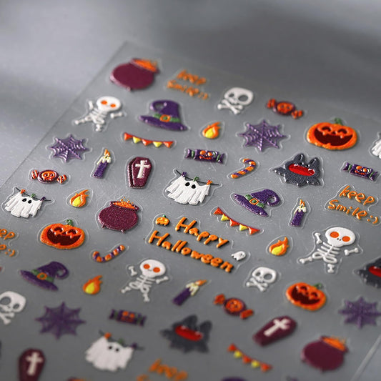 Halloween Nail Art Stickers 5D Embossed Nail Decals Pumpkin Cute Ghost Nail Stickers Skull Spider Web Design Halloween Nail Art Supplies DIY Manicure for Women Girls