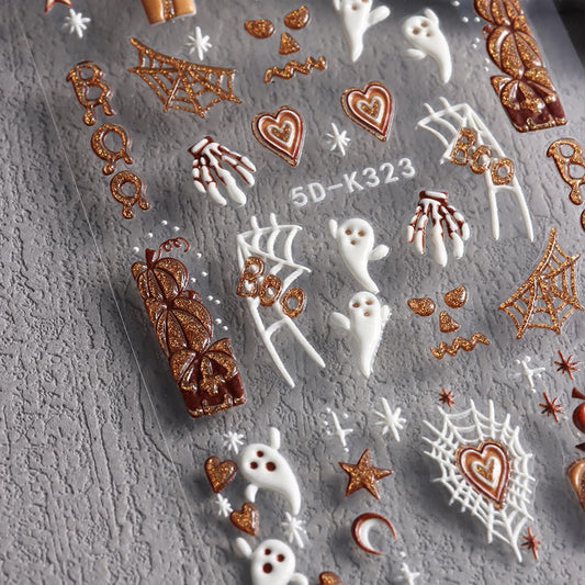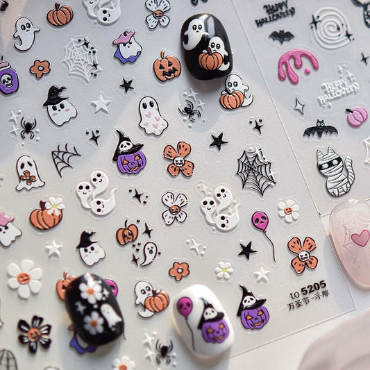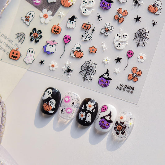 Halloween Nail Stickers Ghost Pumpkin Nail Art Stickers - 5D Embossed Nail Decals, 2 PCS Cute Cartoon Flower Spider Web Candy Designs, Adhesive Sliders for DIY Decorations