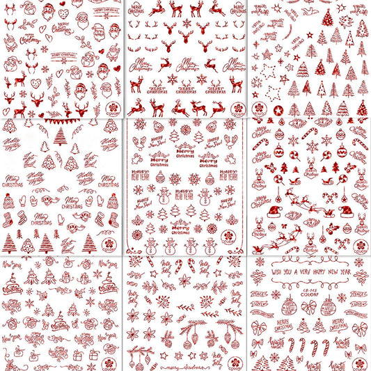 HNUIX Nail Stickers - 3D Christmas, Self Adhesive Nail Decals, Multi Pattern, Red, 9 Sheets, for Nail Art