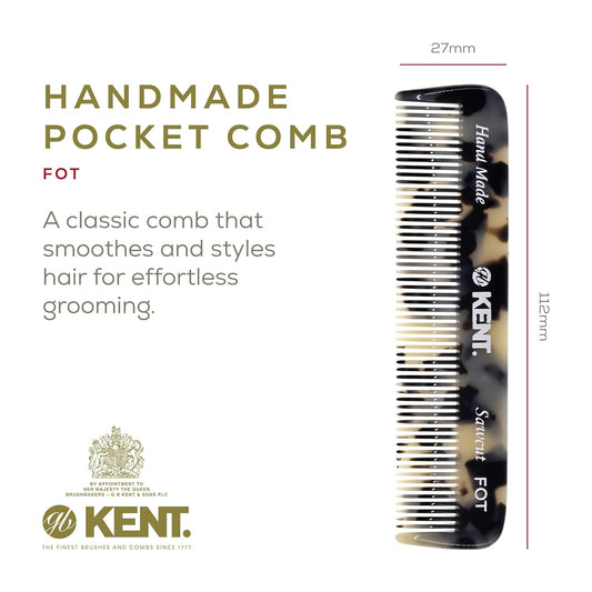 Kent FOT Tortoise Fine Tooth Handmade Pocket Comb for Men, Women and Kids, Hair Comb Straightener for Everyday Grooming and Styling, Beard and Mustache, Saw Cut and Hand Polished, Made in England