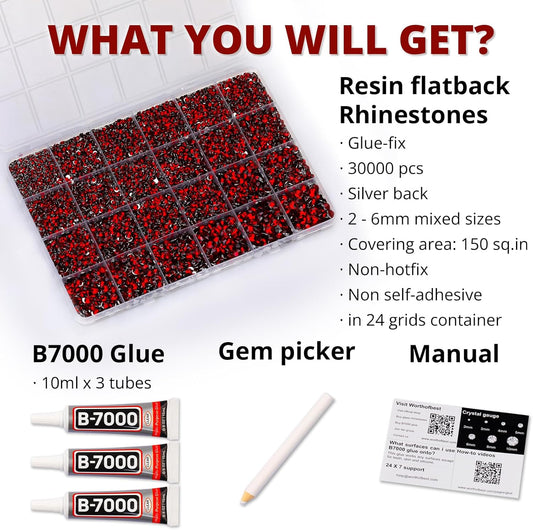 30000Pcs Resin Jelly Rhinestones Set for Crafting Bedazzling, Red ab Flatback Gems Jewels for Crafts Clothes Shoes Fabric Outfit Nails Makeup, Flat Back Crystal 2-6mm with b 7000 Glue