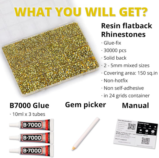 30000Pcs Resin Rhinestones Set for Crafting Bedazzling, Metallic Gold Flatback Gems Jewels for Crafts Clothes Shoes Fabric Outfit Nails Makeup, Flat Back Crystal 2-6mm with b 7000 Glue