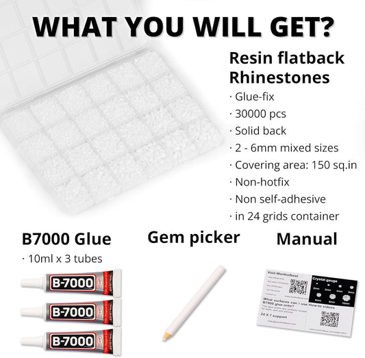 30000Pcs Resin Rhinestones Kit for Crafting Bedazzling, Solid White Flatback Gems Diamonds for Crafts Clothes Shoes Fabric Tumbler Jersey, Flat Back Jewels Bulk Assortment with b7000 Glue