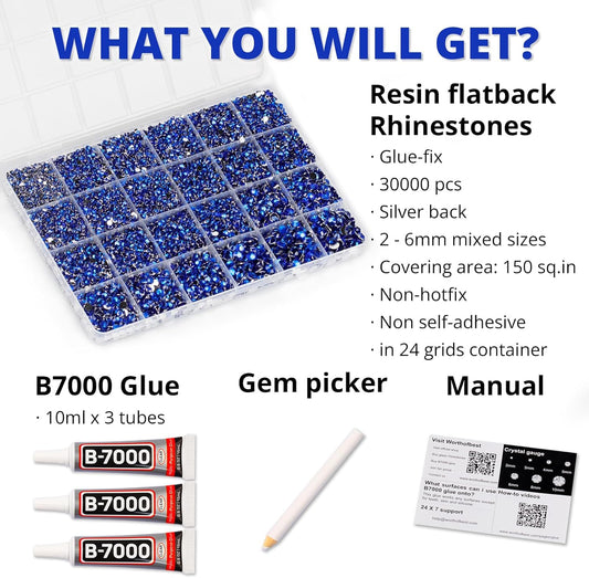 30000Pcs Resin Rhinestones Set for Crafting Bedazzling, Navy Flatback Gems Jewels for Crafts Clothes Shoes Fabric Outfit Nails Makeup, Flat Back Crystal 2-6mm with b 7000 Glue