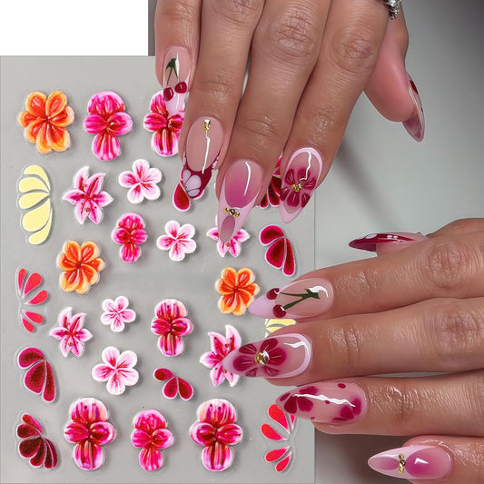 3Sheets 5D Embossed Flowers Nail Art Stickers Self-Adhesive Pink Red Flower Nail Decals Floral French Tips Nail Design Spring Summer Lily Hibiscus Nail Art Supplies for Women Manicure Decorations
