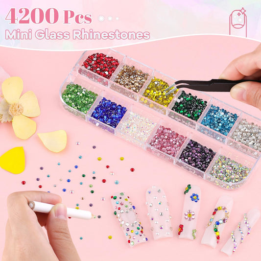 4200Pcs Small Glass Crystal Rhinestones for Nail Art, Colorful SS3-SS10 Flatback Bedazzling Gems, Nail Rhinestones and Gems Crystals Charms for Acrylic Tips Manicure Decor
