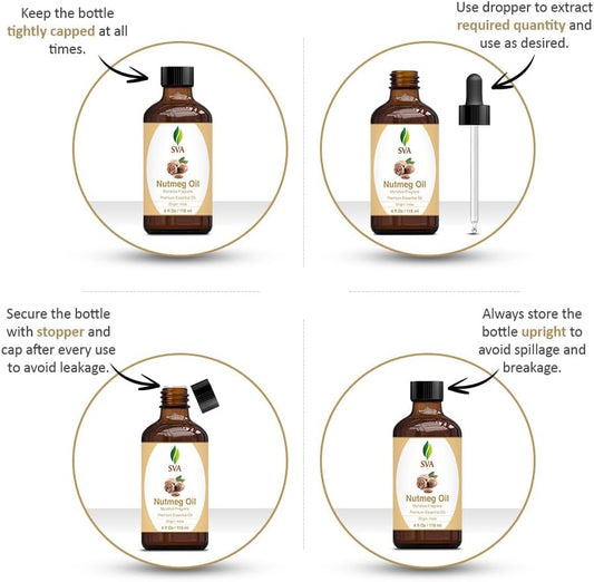 SVA Nutmeg Essential Oil – 4 Fl Oz – 100% Natural Nutmeg Oil - for Diffuser, Hair Care, Face, Skin Care, Aromatherapy, Scalp and Body Massage, Soap and Candle Making – with Dropper