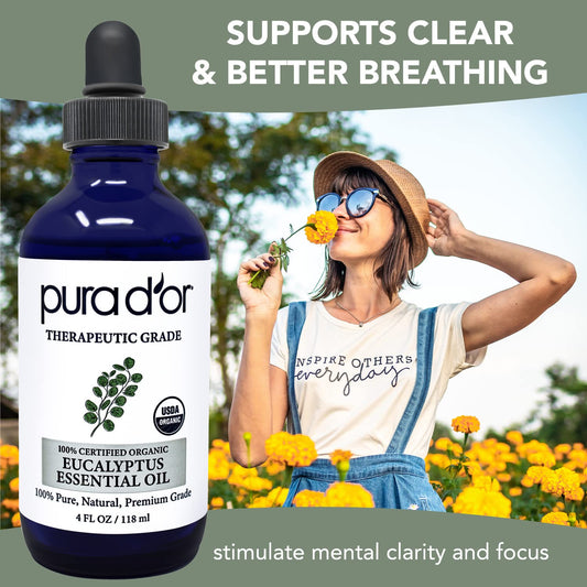 PURA D'OR Organic Eucalyptus Essential Oil (4oz with Glass Dropper) 100% Pure & Natural Therapeutic Grade for Hair, Body, Skin, Aromatherapy Diffuser, Relaxation, Massage, Home, DIY Soap