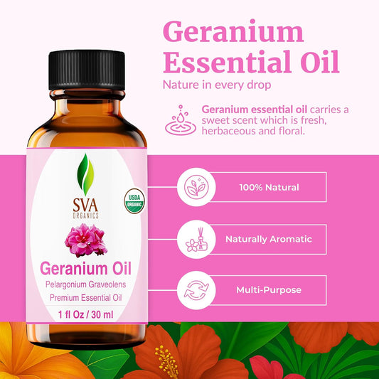 SVA Geranium Essential Oil Organic – 1 Fl Oz – 100% Natural Organic Geranium Oil - for Diffuser, Hair Care, Face, Skin Care, Aromatherapy, Scalp and Body Massage, Soap and Candle making – with Dropper