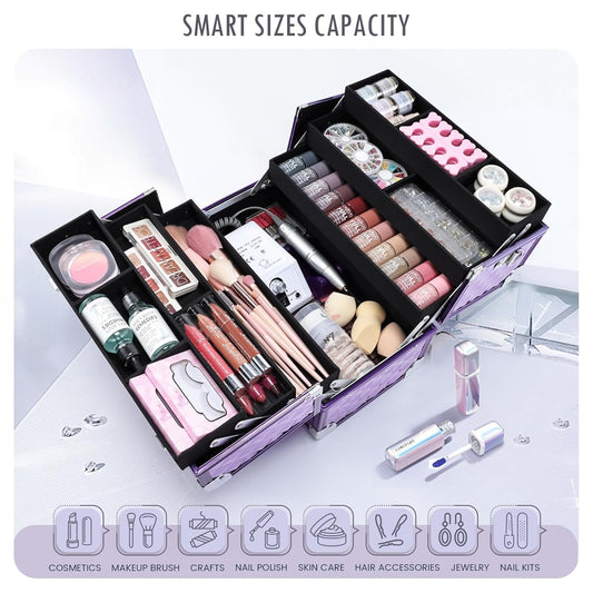 FRENESSA Makeup Train Case Makeup Case 12.6 Inch Large Cosmetic Box Organizer Travel Storage Professional Make Up Train Carrying Case with 6 Trays Locking Shoulder Strap Hard Vanity Storage Purple
