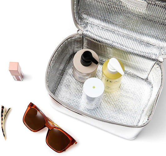 Large Insulated Metallic Silver Travel Makeup Case - Waterproof Vegan Leather Beauty Travel Skincare Bag - Heat-Resistant Zippered Designer Makeup Bag Shields Cosmetics from Melting, Freezing