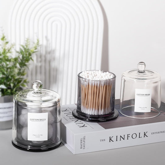 3 Pack Glass Qtip Holder Dispenser Set - Apothecary Jars with Lids for Vanity Makeup Organizer - Bathroom Canister Storage Organizer for Cotton Ball,Swab,Round Pads,Floss