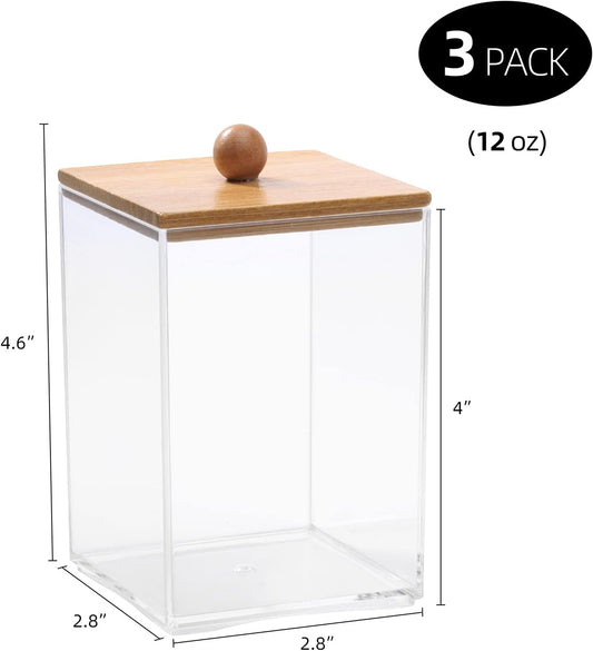 Tbestmax 3 Pack Square Qtip Holder - 12 oz Bathroom Organizers and Storage Containers, Plastic Apothecary Jars with Bamboo Lids for Cotton Ball, Cotton Swab, Floss