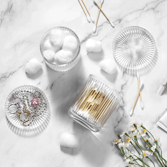 Glass Qtip Holder with Lid,Bathroom Organizer and Storage Jars - Apothecary Jars for Cotton Balls, Cotton Swabs,Pads,Floss Picks,Vanity Organizer,Bathroom Accessories and Countertop Storage Canisters