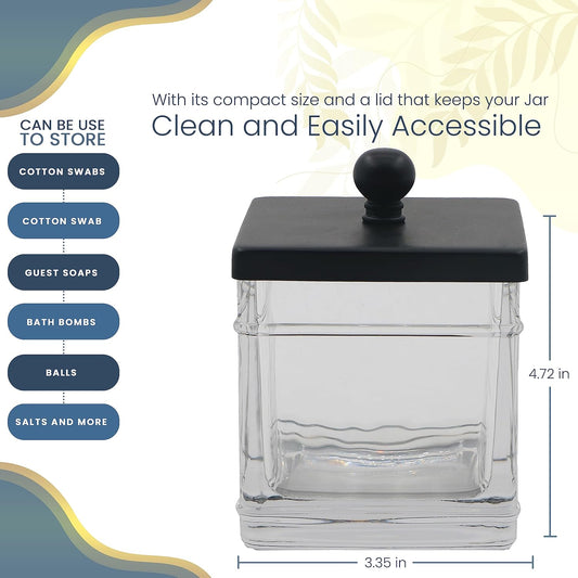 Glass Cotton Jar Holder 2 Pack– Matte Black Lid, Elegant Bathroom Storage Canister for Qtips, Cotton Balls, Floss, Makeup Organizer, Vanity & Bathroom Organization