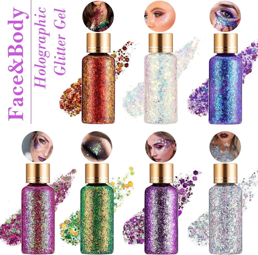 Clear White Face Body Hair Glitter Gel for Women Kids, Changes Color with The Angle and Light, Holographic Mermaid Sequin Sparkling Paint Makeup for Halloween Festival Rave Accessories, 1oz