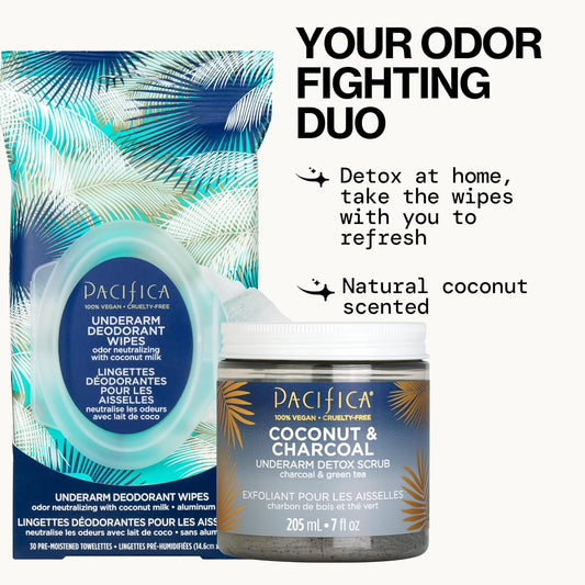 Pacifica Underarm Detox & Odor Control Bundle – Coconut & Charcoal Armpit Scrub and Coconut Deodorant Wipes, Aluminum-Free Underarm Care Set for Natural Deodorant Users