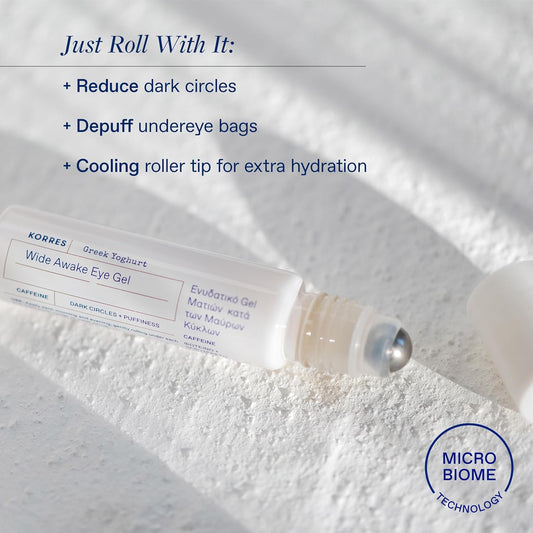 KORRES Greek Yoghurt Wide Awake Eye Gel Serum with Hyaluronic Acid and Caffeine for Dark Circles, Puffy Eyes and Under Eye Bags, Roller Massage Ball Applicator, Brightening and Hydrating, 0.51 fl oz