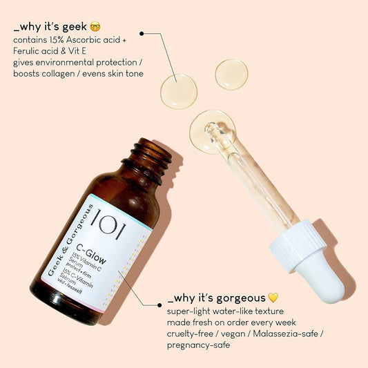 Geek & Gorgeous - C-Glow - 15% Vitamin C + Ferulic acid & Vitamin E Serum, protects against environmental damage, boosts collagen & evens skin tone - all skin types, 1 oz