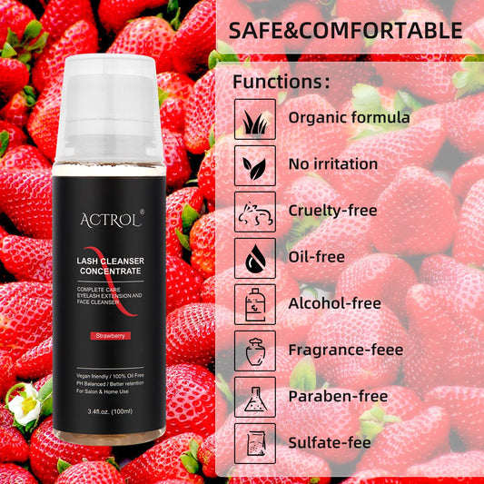 Eyelash Cleanser Concentrate 100ml Strawberry Professional Lash Shampoo Foaming Cleanser Paraben & Sulfate Free Non-lrritating Wash for Extensions Lashes Care-Makes 20 Bottles