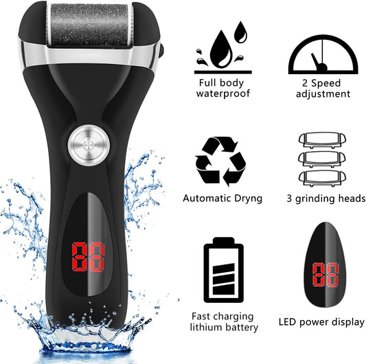 Electric Foot Callus Remover Kit, Elmchee Rechargeable Pedicure Tools Foot Care Feet File with 3 Roller Heads,2 Speed,Battery Display for Remove Cracked Heels Calluses and Dead Skin(Black)