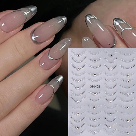 8Sheets French Line Nail Stickers, 3D Sticker for Nail Art Gold Silver White Lines Adhesive Tapes Stripes Swirl with Diamond Nail Design Curved Gel Nail Art Sliders Polish Manicure Tip Nail Decoration