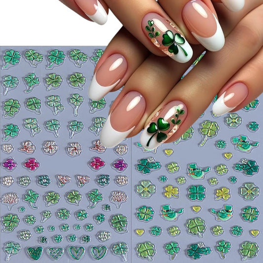 2 Sheets Irish Four-Leaf Clover Nail Art Stickers St. Patrick's 5D Self-Adhesive Embossed Green Shamrock Nail Decals Design Lucky of Irish Spring Leaf Nail Supplies for Women Nail Decoration