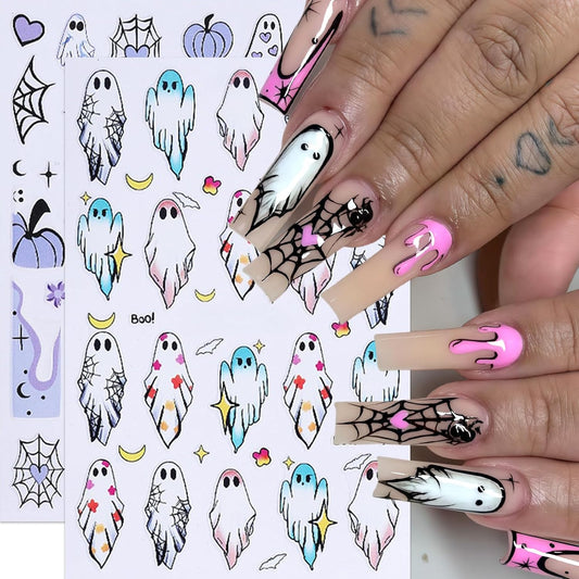 8Sheets Halloween Nail Stickers for Nail Art,3D Self-Adhesive Cute Ghost Spider Nail Decals Pink Red Horror Pumpkin Heart Spider Web Nail Design Nails Supplies for Women Manicure Holiday Decorations