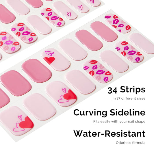 NAILOG Semi Cured Gel Nail Strips for Valentine's Day, 34 pcs Salon-Quality Gel Nail Stickers, Long Lasting Nail Wraps for Women with Soft Gel Finish Pink(Seal of Love)