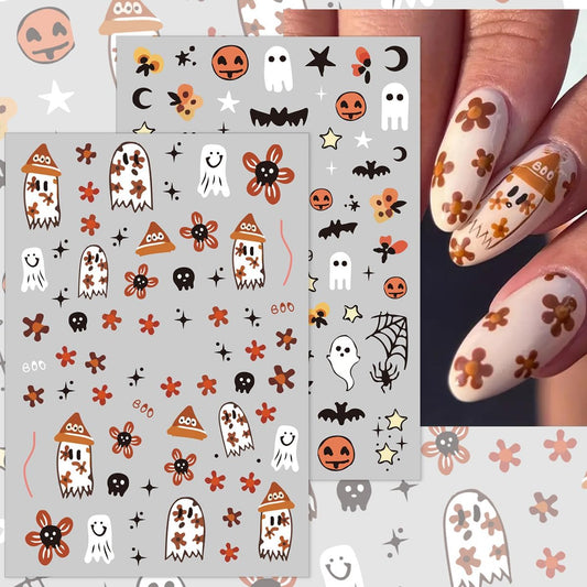 Halloween Nail Art Stickers - 3D Pumpkin, Spooky Ghost, Spider Web, Bats Decals - Self Adhesive Nail Design Stickers for Women DIY - 8 Sheets Decoration