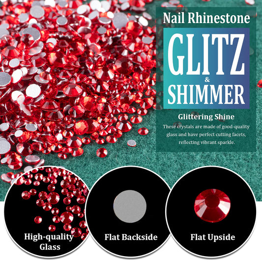 6 Sizes Red Glass Crystal Kit with Pickup Pen + Tweezer Tools for Shine Nail Art Manicure Makeup DIY Decoration Flatback Round Rhinestone Gem Jewelry Diamond