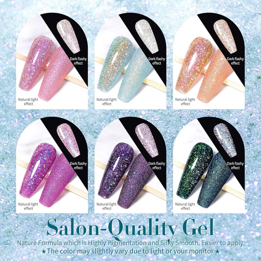 BORN PRETTY Reflective Glitter Gel Nail Polish Pink Holographic Colorful Glitter Spring Summer Gel Polish Sparkly Shiny Disco DJ LED Gel Nail Polish Nail Varnish 6PCS