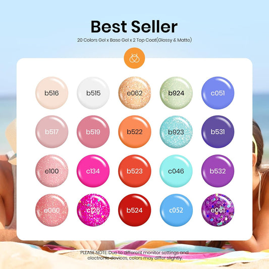 Beetles Gel Nail Polish Set, 20 Colors Blue Nude Pink Purple Orange Glitter Gel Polish Glamour Games Collection with Base Top Coat Nail Art Soak off Nail Manicure Gift for Girls Women
