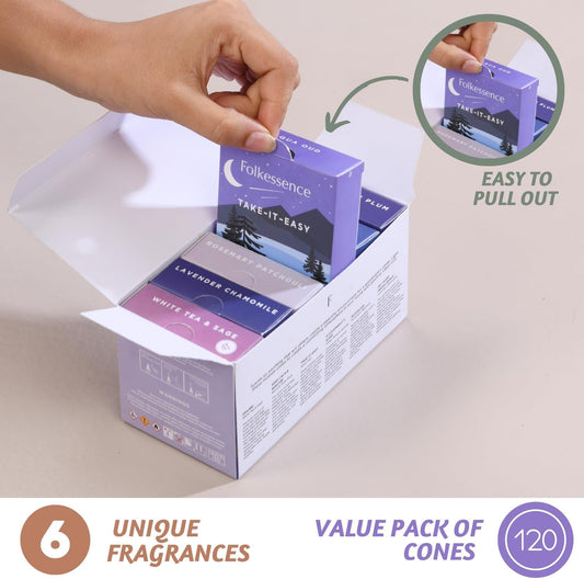 Folkulture Incense Cones Scented | Set of 6 Fragrances (120 Cones) with Incense Cones Holder for Relaxation | Rosemary Jasmine, Patchouli Incense, Lavender Incense Variety Pack | Inscents-Cones